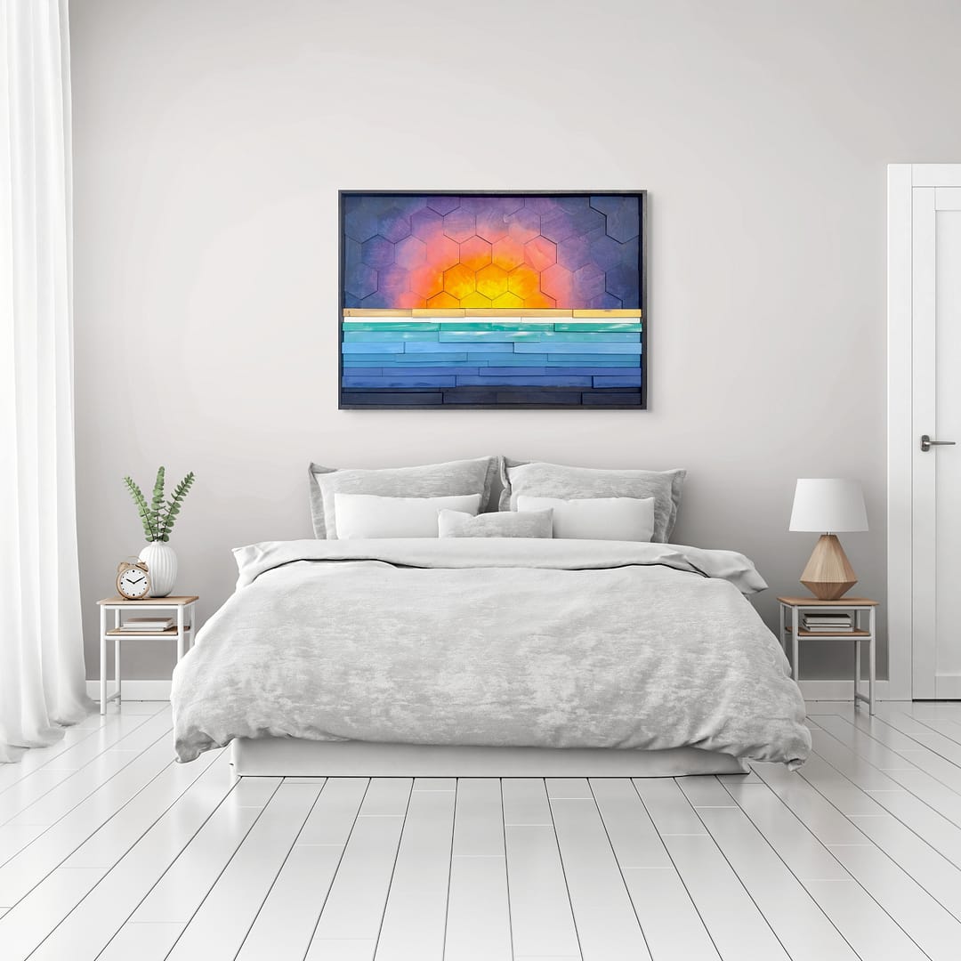 Hexagon Horizon Sunrise plays with warm sunrise colors and repeating shapes to echo a glowing sky over a quiet horizon. It adds a little dawn energy to any room, any time of day.